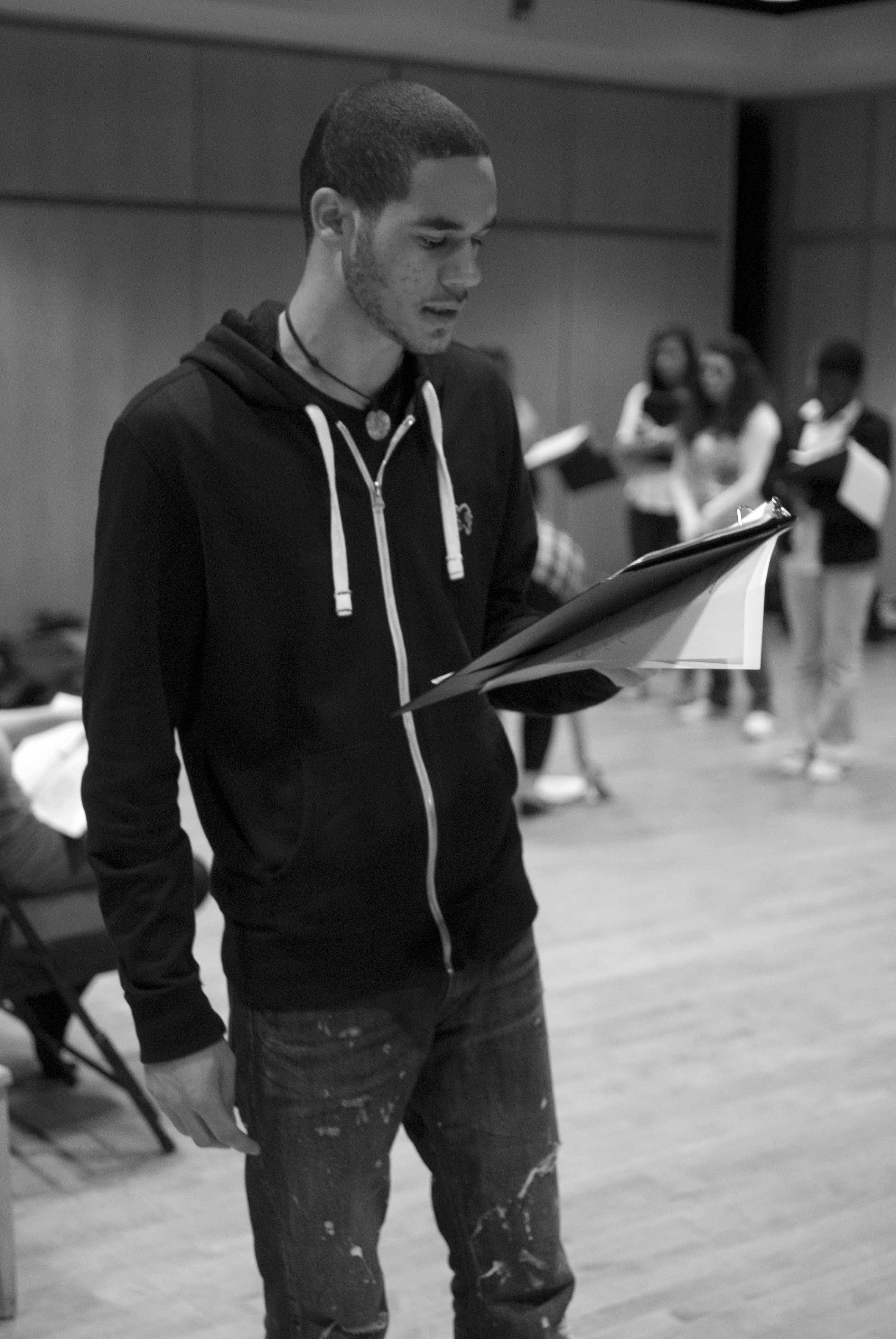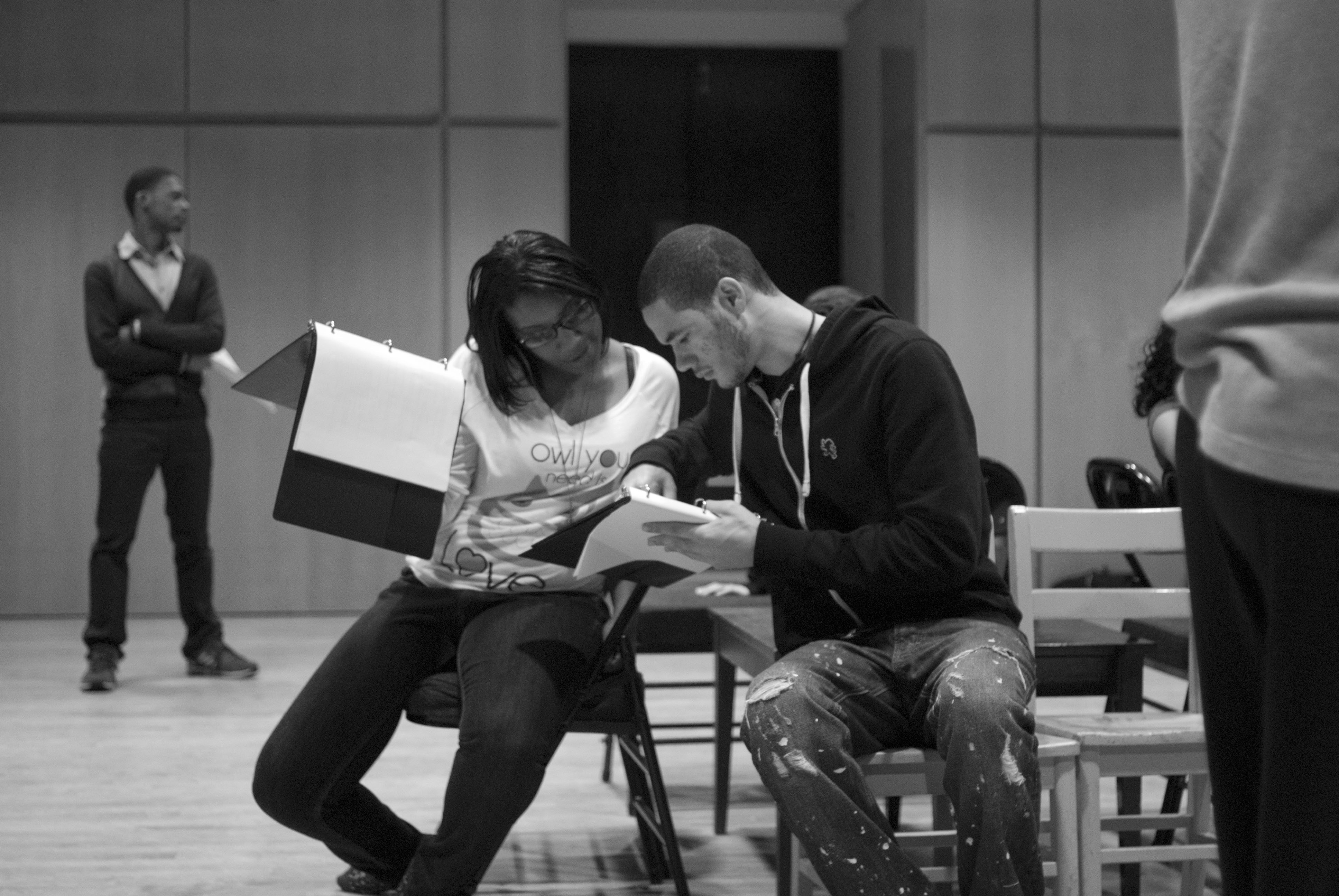 One student, Esther Rose-Wilen, who goes to Wilbur Cross, explained to another student her idea behind a scene she’d written. “If they did treat us like humans, we would be more motivated and stay in school.” The student listening, Tavist Jones, a senior at High School in the Community, told her he understood and wouldn’t cut too much from her scene—he would just try to make that point “less vague.”