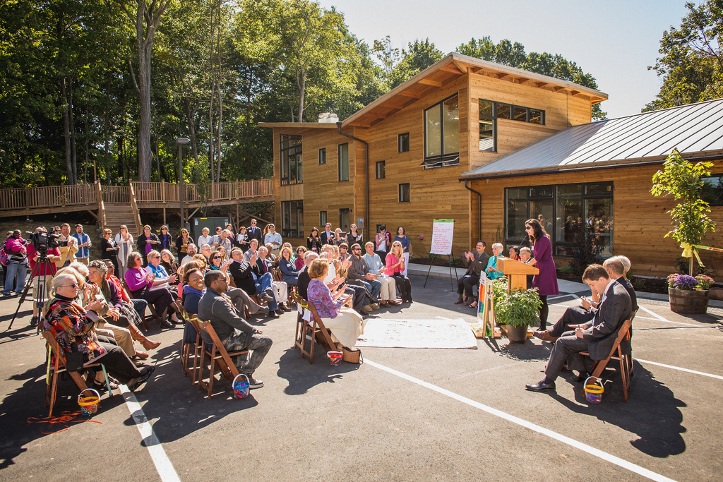 On the September morning that I arrive at the center, all is quiet, the cacophony of construction now absent. An unassuming wood and glass façade peeks out from behind the dark brown, two-story Quaker meeting house. The obtuse angles and metal paneling of its roof distinguish it from the quaint twentieth-century mill houses on the street. The building, I learn later, was built to gold-level LEED certification, with walls made from local cedar wood, a geothermal heating system, and a rooftop garden.