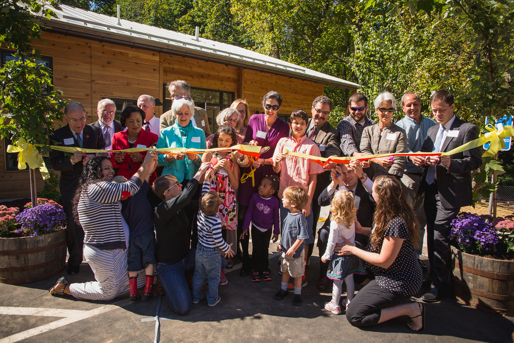 Many share his optimism. At the ribbon cutting, graduates of the original basement preschool stream in, as do parents, mayoral candidates, and neighbors. Passing by a white press tent, they settle into seats set up in front of the Friends Center door. A large easel with lined white paper displays the agenda in large, curly handwriting. Brightly-colored buckets filled with scissors sit at the end of each row of chairs. Then a line of preschoolers, holding hands, emerges from the playground gate. The crowd quiets as they watch the children find their seats—right in front.