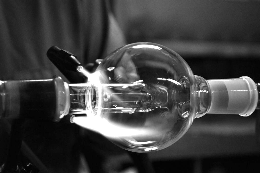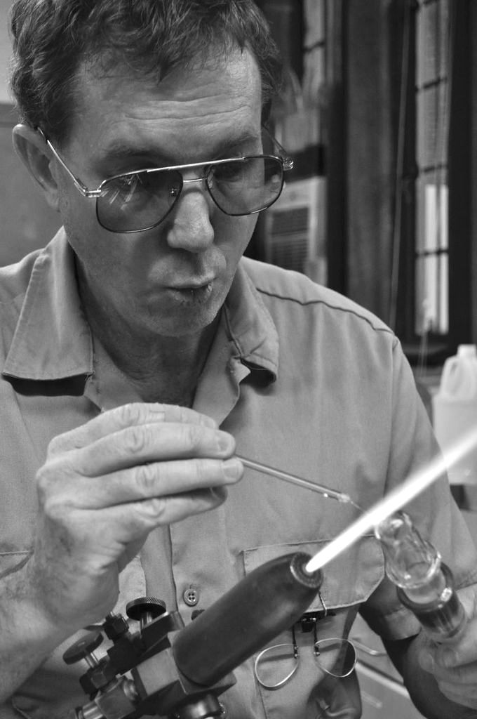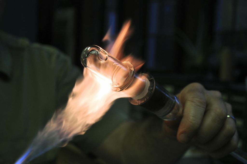 Four thin blue flames lick the underbelly of a glass flask as Daryl Smith steadies his blowtorch. With sweat dripping from his forehead, he directs the heat at one of three stumpy tubes attached to the spherical flask. The glass glows white-hot and starts to melt. Just as the tube begins to droop, Smith snatches it away with a pair of tweezers. The tube stretches until all that connects it to the flask is a long, thin thread. When the thread breaks, a spark of light appears as the chemical bonds in the glass split apart. The glass closes around the quarter-sized hole where the tube once was. During this minute-long part of the process, Smith has been holding a hose between his teeth that connects his mouth to the sphere. He breathes a puff of air into the sphere, and the hole reappears, leaving space for Smith to push the tube in again. He works without talking; the only noise in the studio comes from the jazz playing on a radio in the background.