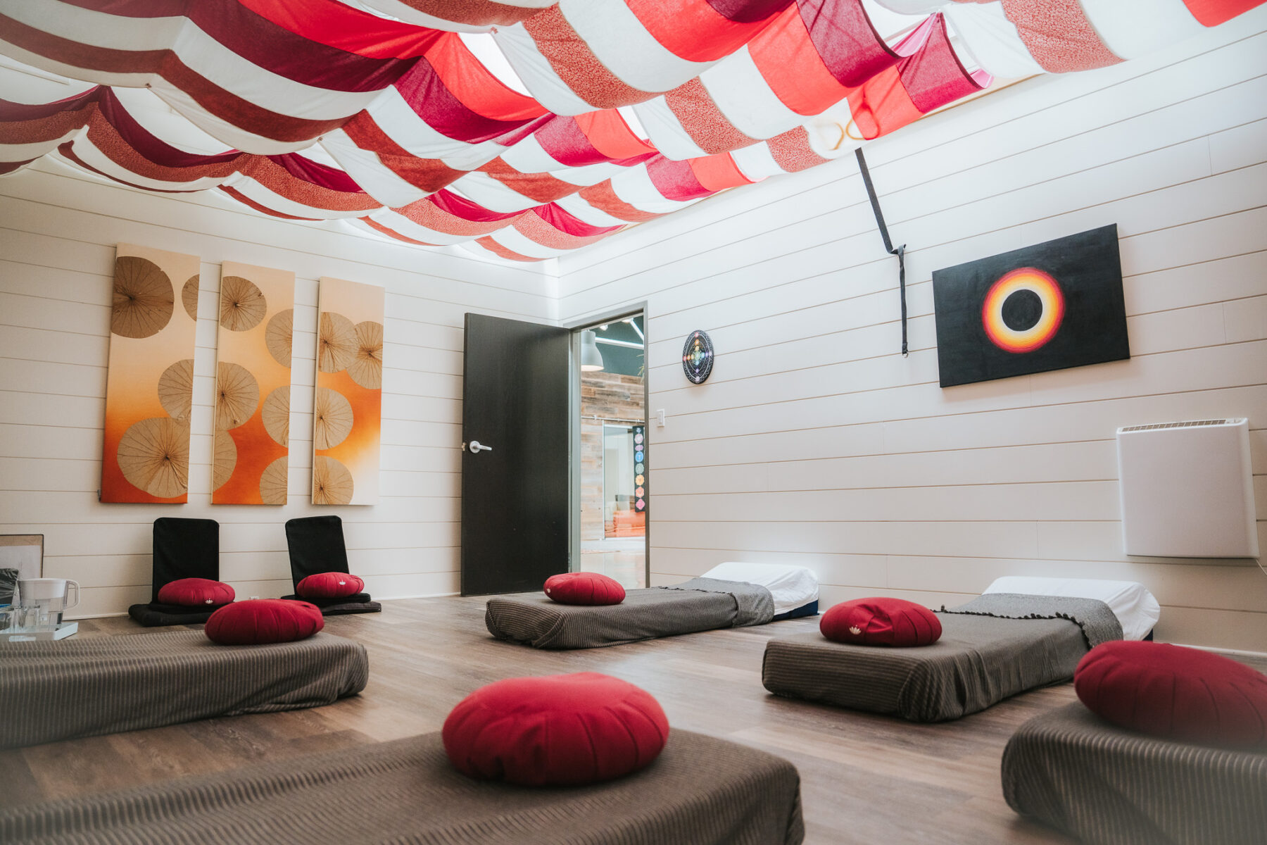 I sat in on one of these. Across Centered’s couches, patients sat chatting, scrolling, meditating. In the dosing room, eight thin mattresses lay directly on the wood floor in a loose U-shape, all beneath draped strips of red and white fabric that gave the room a feel somewhere between a ceremonial pavilion and a carnival tent.
